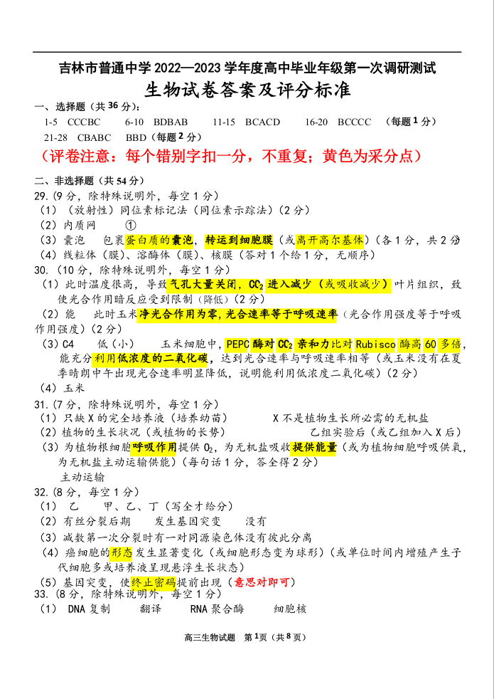 高三生物答案--吉林省吉林市2022-2023学年高三上学期第一次调研测试