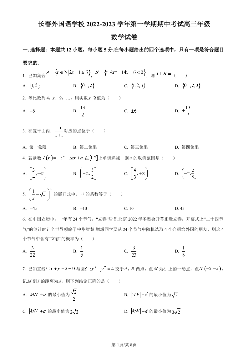 高三数学+答案--吉林省长春外国语学校高三上学期期中考试