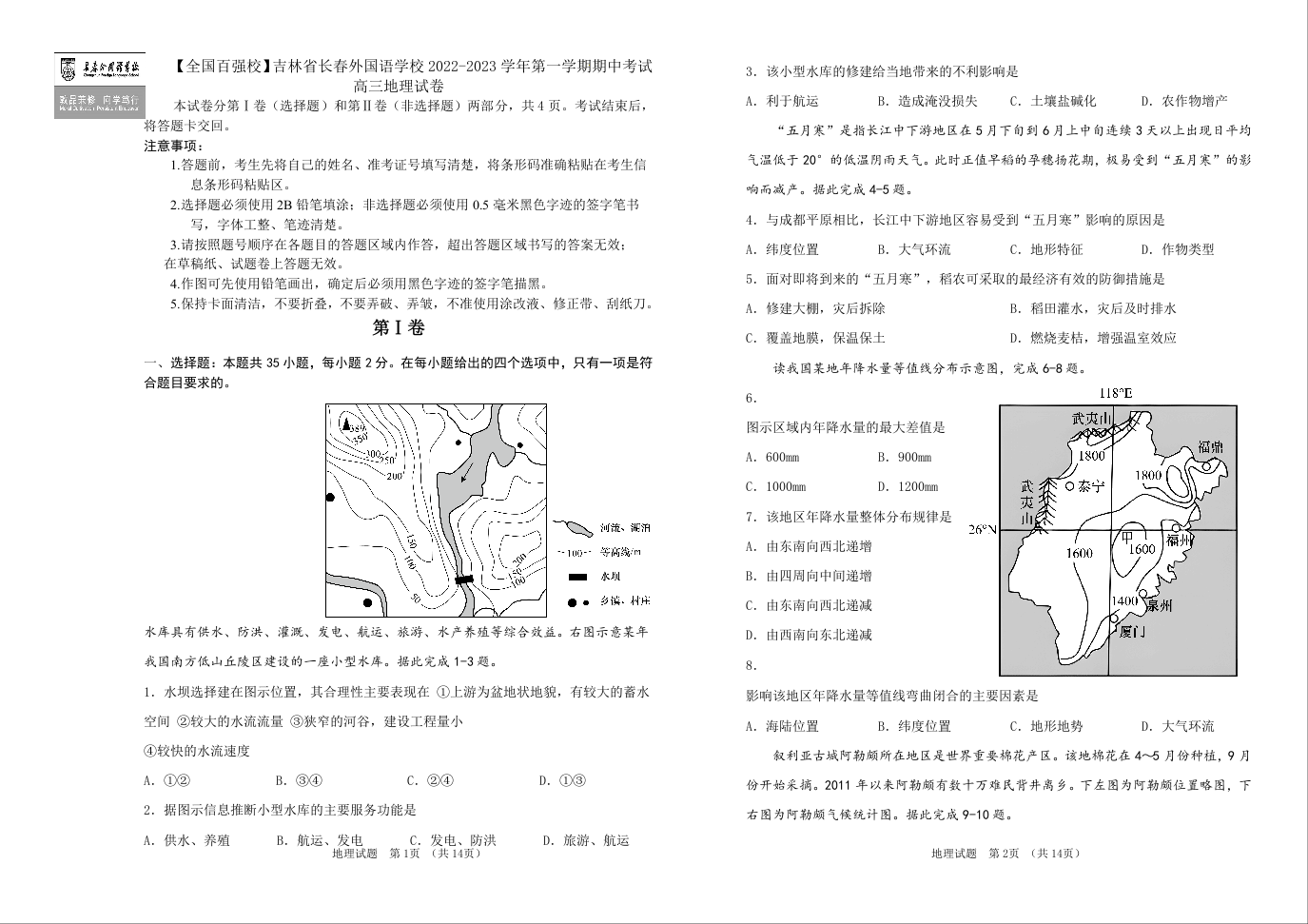 高三地理+答案--吉林省长春外国语学校高三上学期期中考试