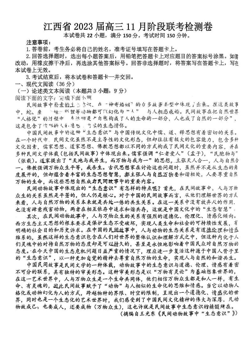 高三语文+答案--江西省临川第一中学高三上学期11月教学质量检测