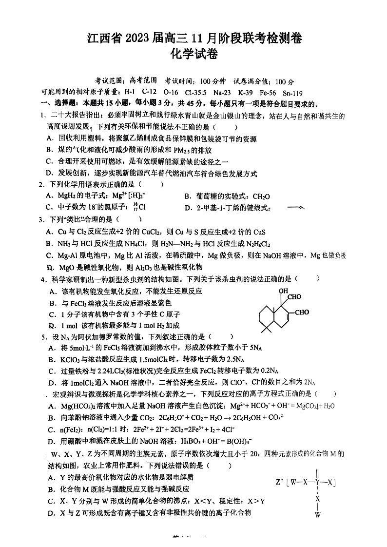 高三化学+答案--江西省临川第一中学高三上学期11月教学质量检测