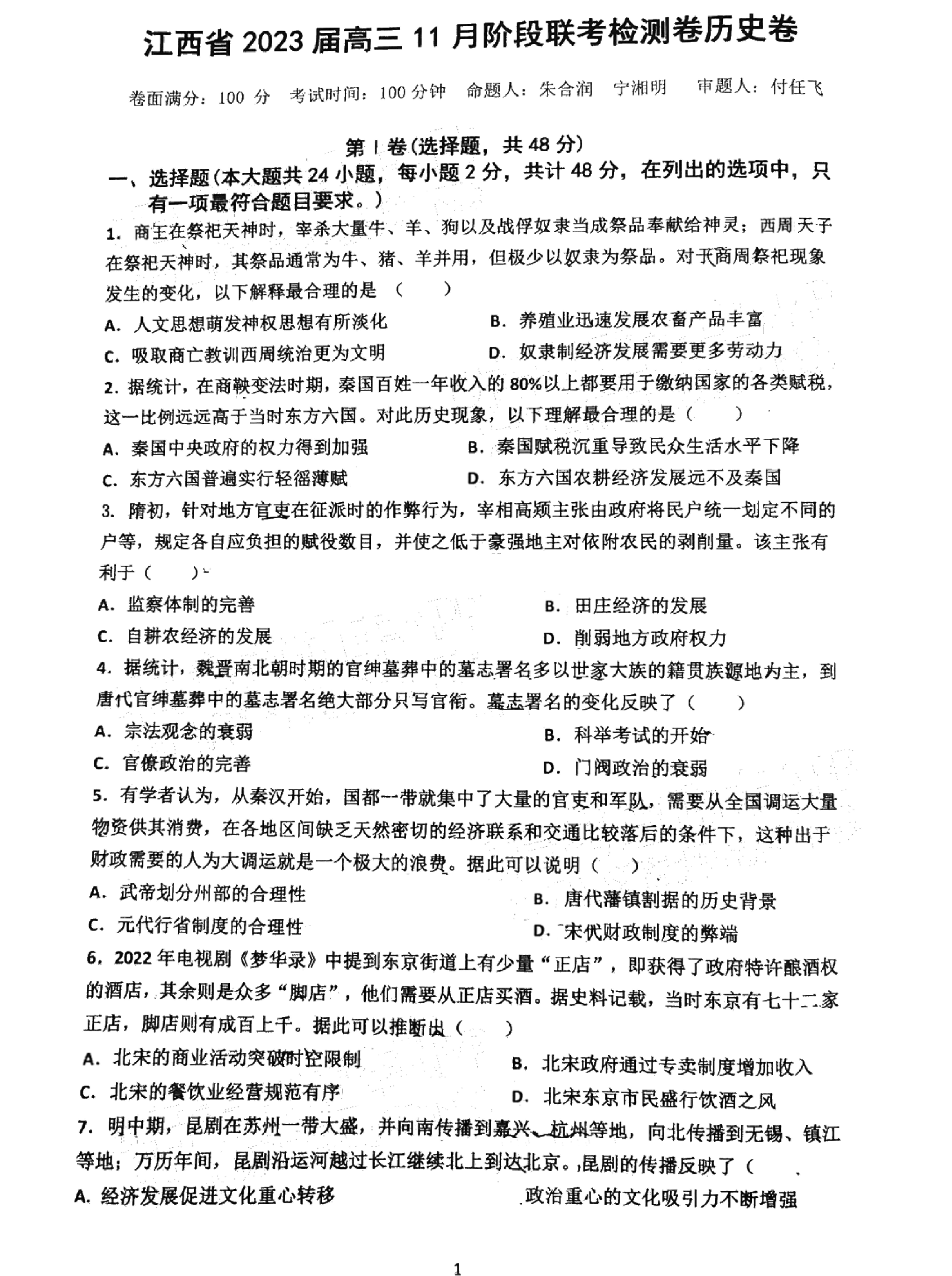 高三历史--江西省临川第一中学高三上学期11月教学质量检测