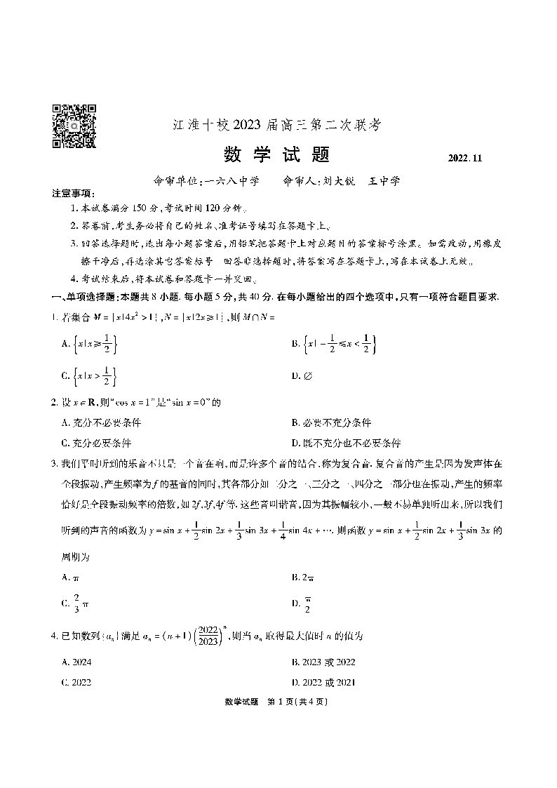 高三数学--江淮十校2023届高三第二次联考