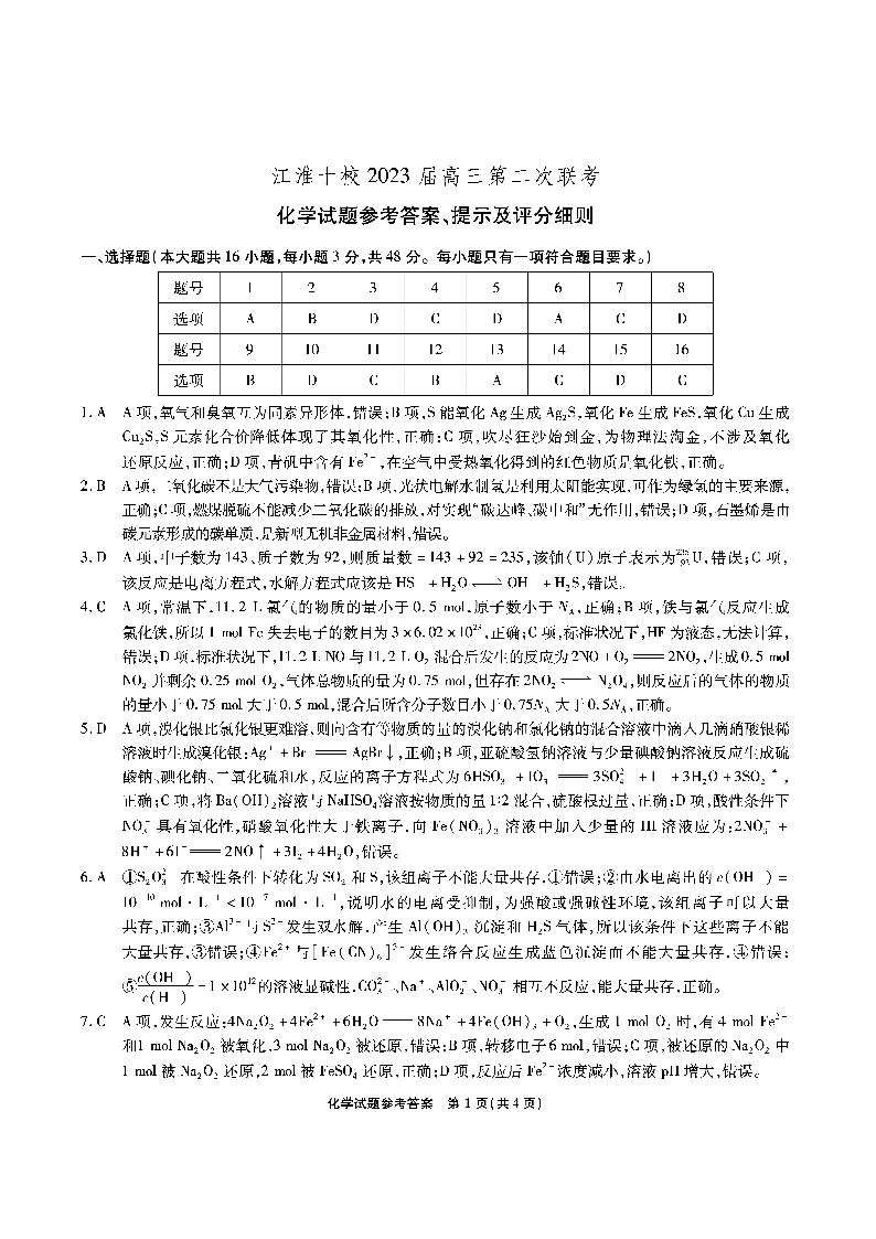 高三化学答案--江淮十校2023届高三第二次联考