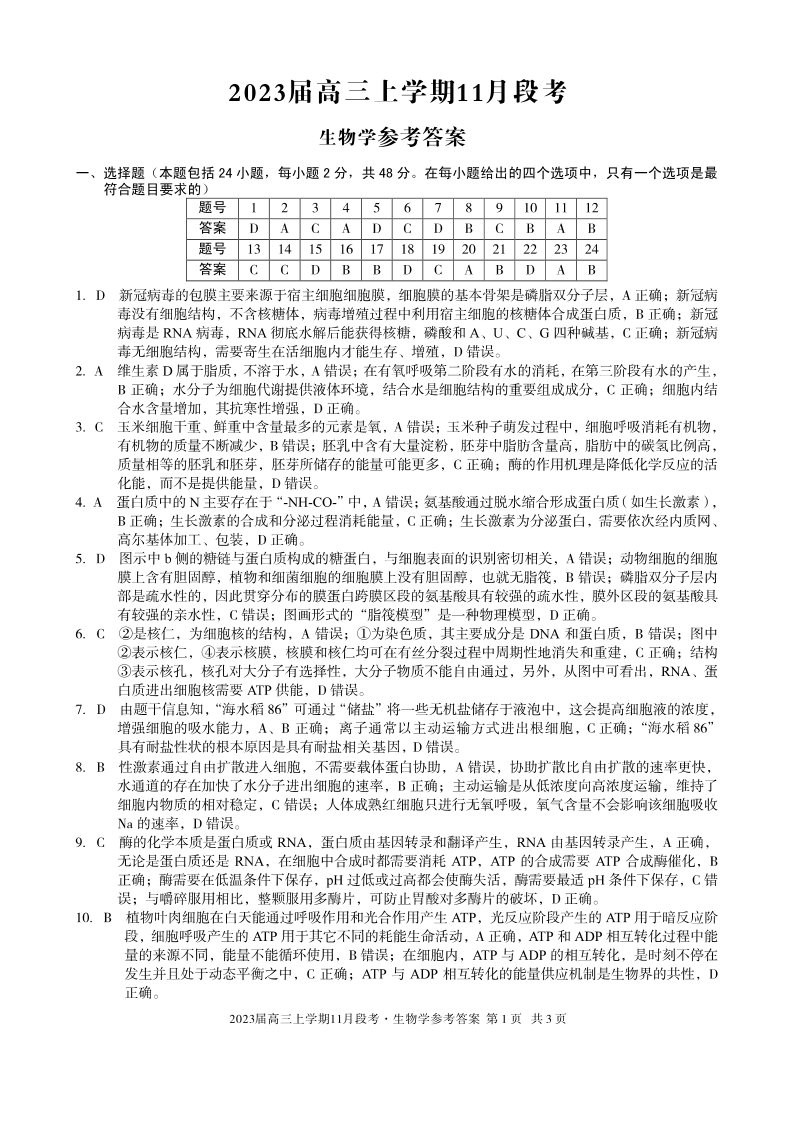 高三生物答案--江西省A10联盟高三上学期11月段考