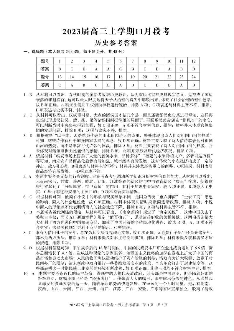 高三历史答案--江西省A10联盟高三上学期11月段考