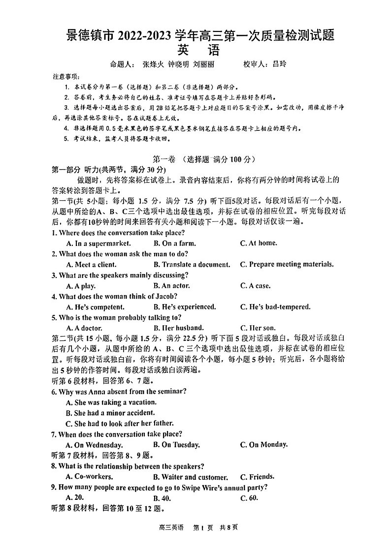 高三英语+答案--江西省景德镇市2023届高三一模