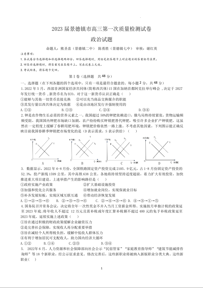 高三政治+答案--江西省景德镇市2023届高三一模
