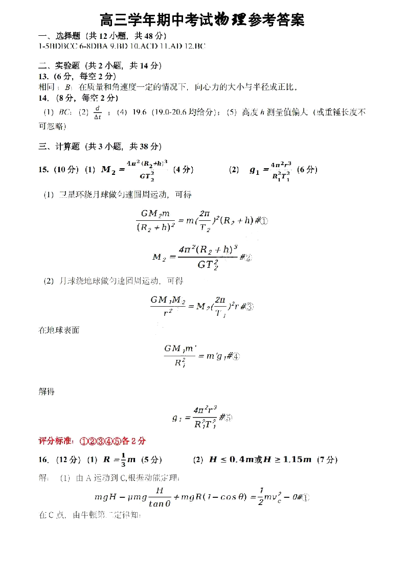 高三物理答案--黑龙江省哈尔滨市第三中学校2023高三上学期期中考试