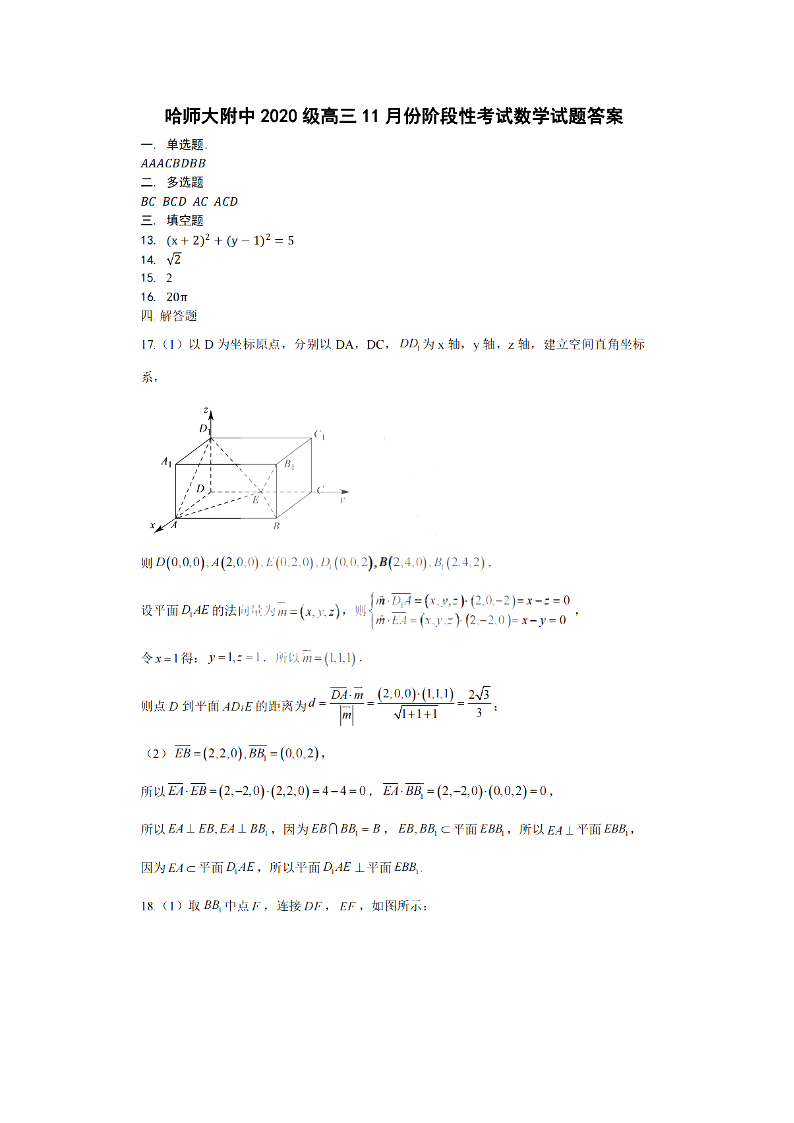 高三数学答案--黑龙江省哈尔滨师范大学附属中学2023高三上学期11月阶段性考试考试