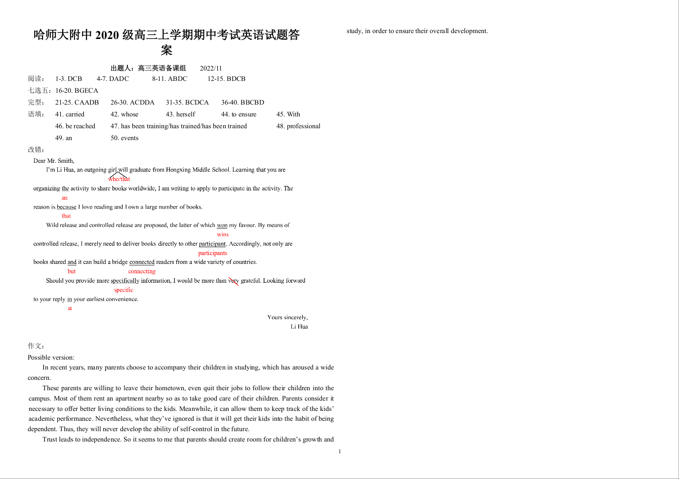 高三英语答案--黑龙江省哈尔滨师范大学附属中学2023高三上学期11月阶段性考试考试