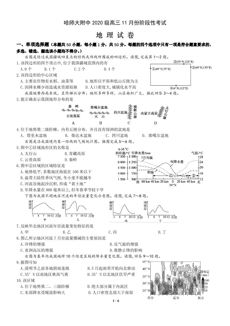 高三地理--黑龙江省哈尔滨师范大学附属中学2023高三上学期11月阶段性考试考试