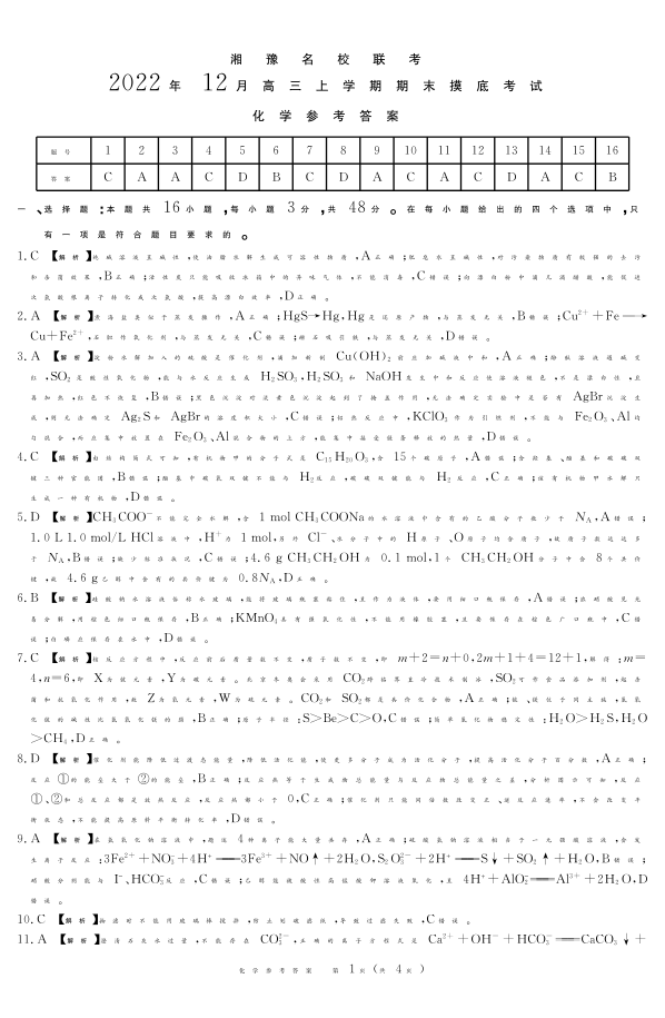 高三化学答案--河南省湘豫名校联考2023高三上学期12月期末摸底考试