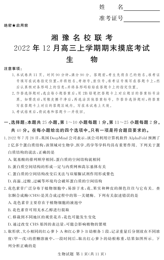 高三生物--河南省湘豫名校联考2023高三上学期12月期末摸底考试