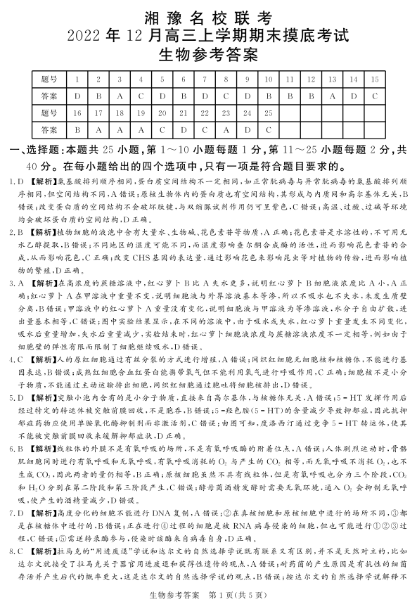 高三生物答案--河南省湘豫名校联考2023高三上学期12月期末摸底考试