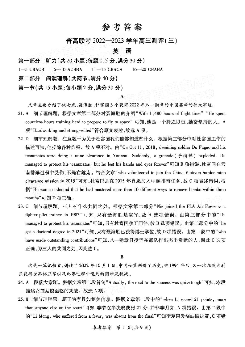 高三英语答案--河南省普通高中联考2022-2023学年高三上学期测评(三)