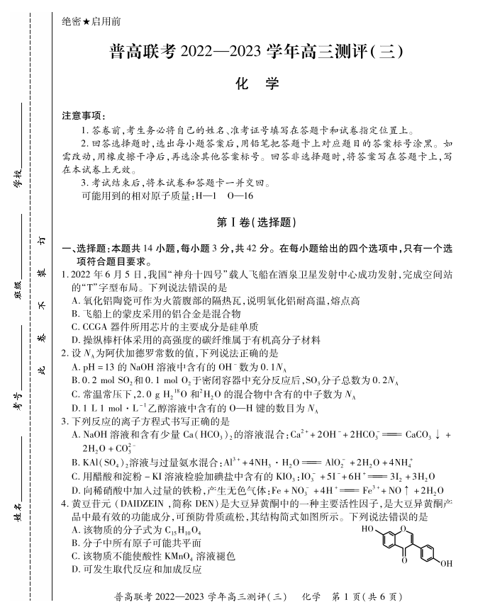 高三化学+答案--河南省普通高中联考2022-2023学年高三上学期测评(三)