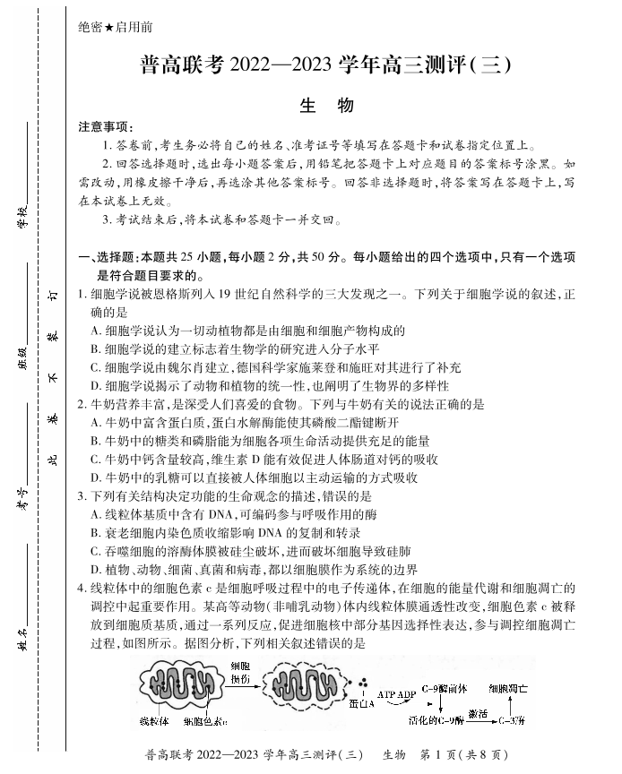 高三生物+答案--河南省普通高中联考2022-2023学年高三上学期测评(三)