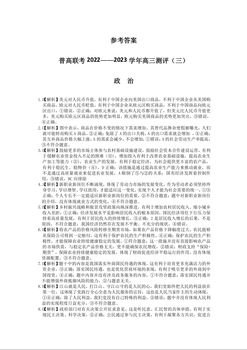 高三政治答案--河南省普通高中联考2022-2023学年高三上学期测评(三)