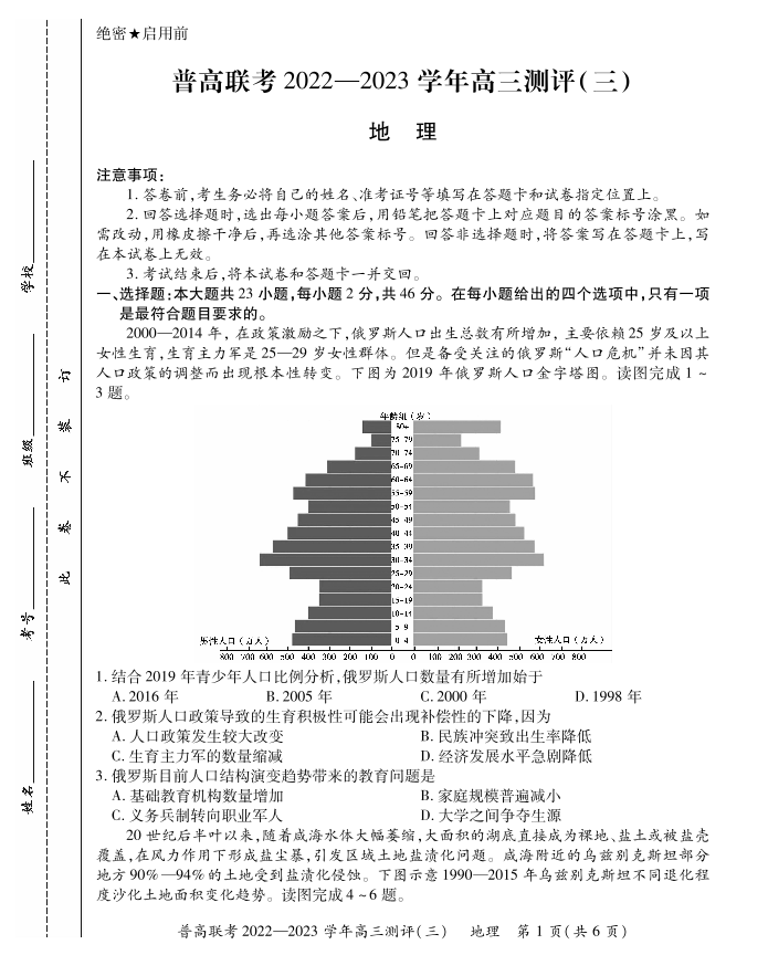 高三地理+答案--河南省普通高中联考2022-2023学年高三上学期测评(三)