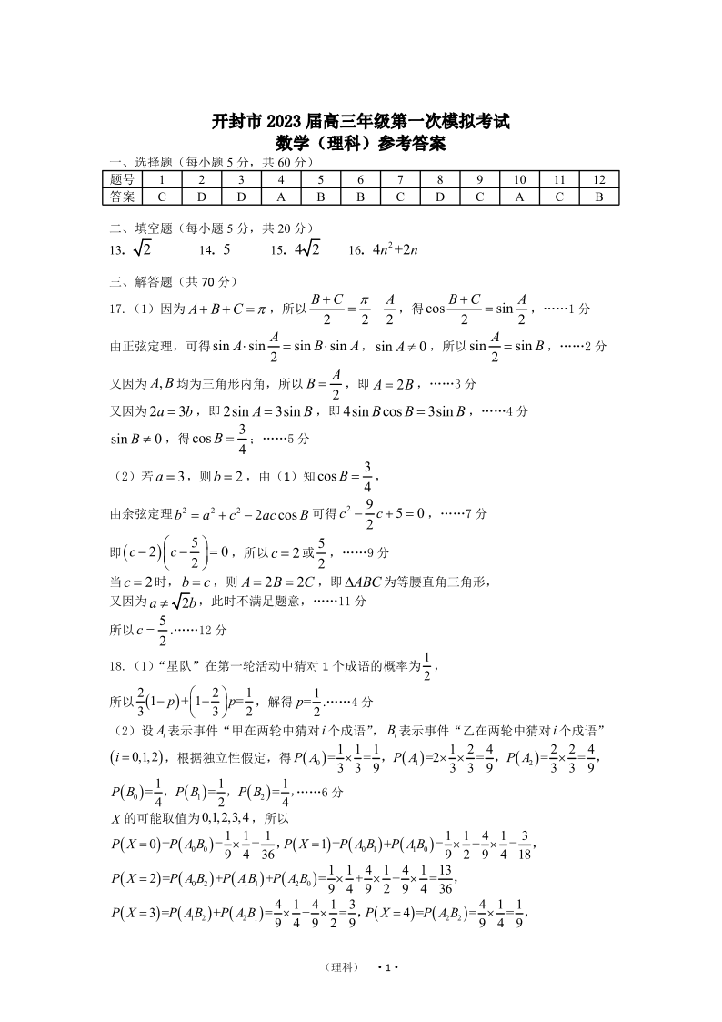 高三数学答案(理)--河南省开封市2023高三上学期一模考试