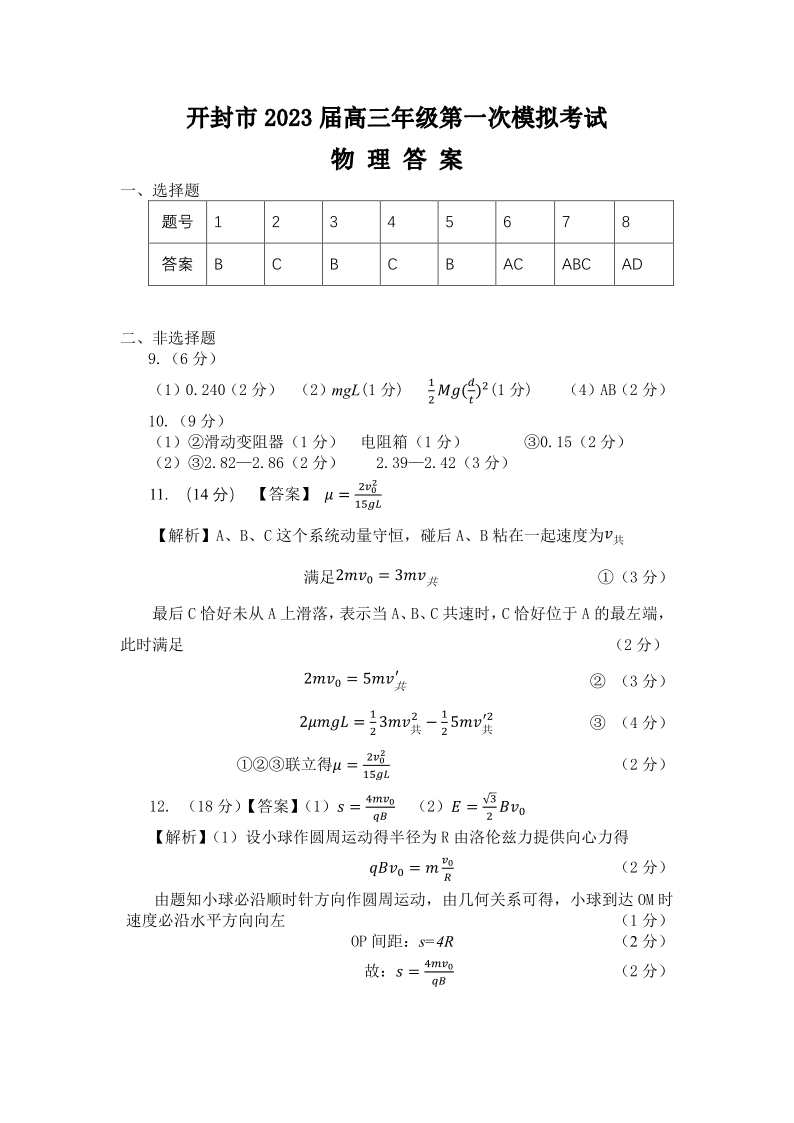 高三物理答案--河南省开封市2023高三上学期一模考试