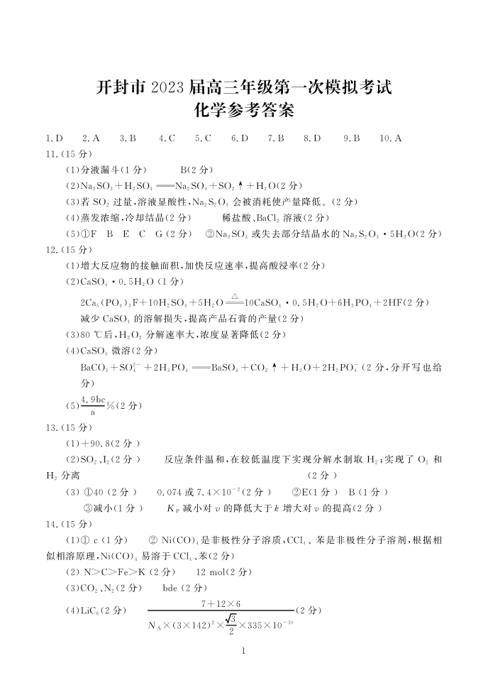 高三化学答案--河南省开封市2023高三上学期一模考试