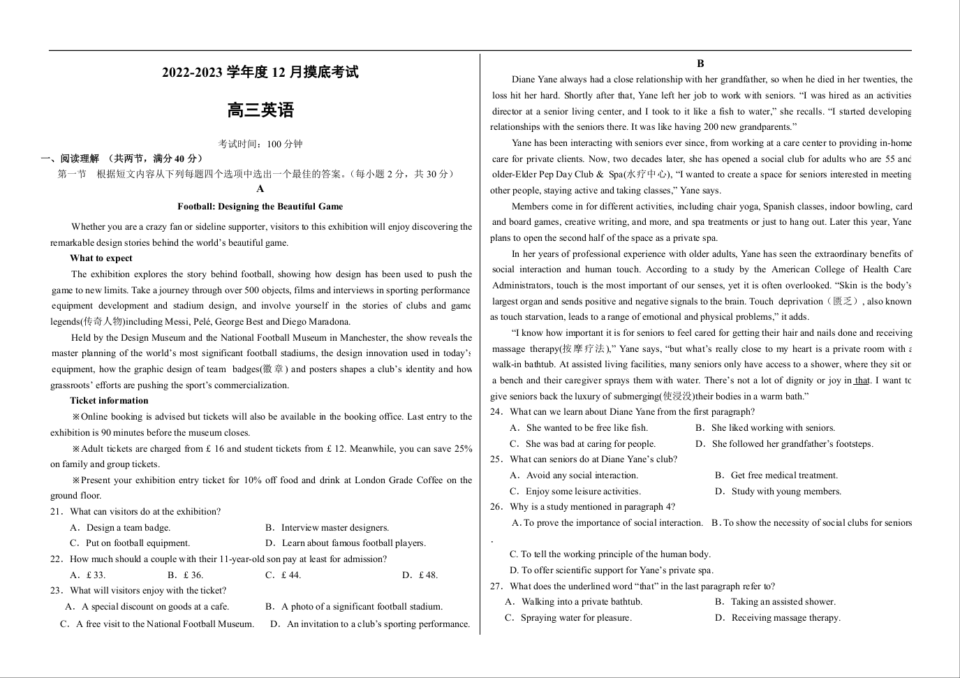 高三英语--河南省顶级名校2023高三上学期12月摸底考试
