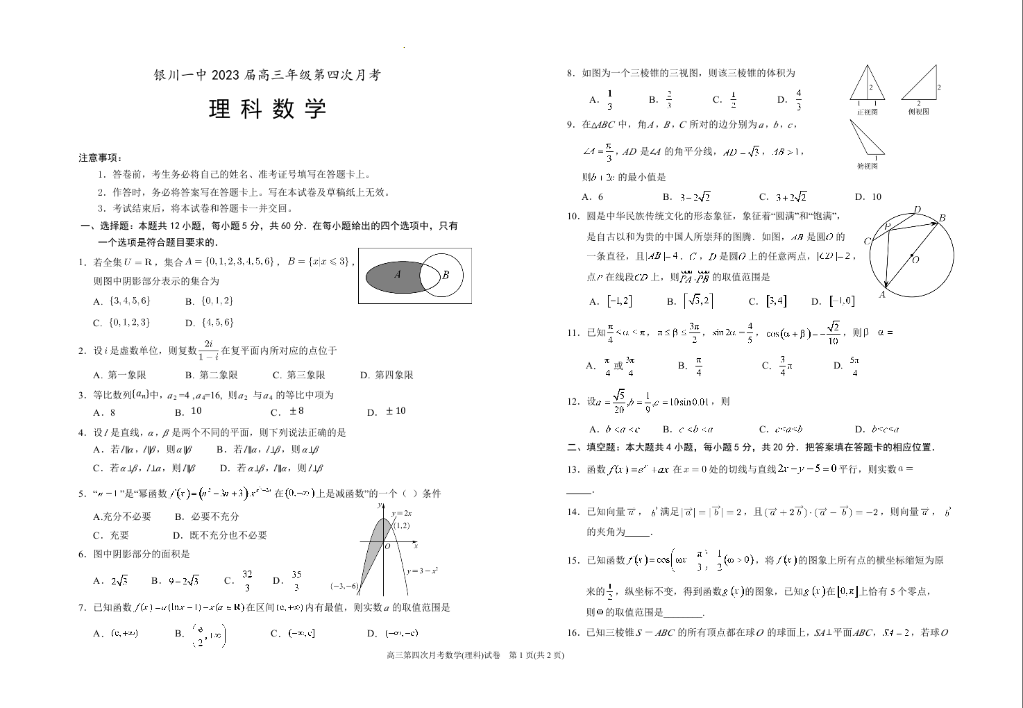 高三数学(理)+答案--宁夏回族自治区银川一中2022-2023学年高三上学期第四次月考