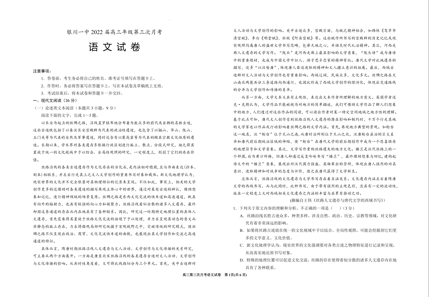 高三语文+答案--宁夏银川一中高三上学期第三次月考