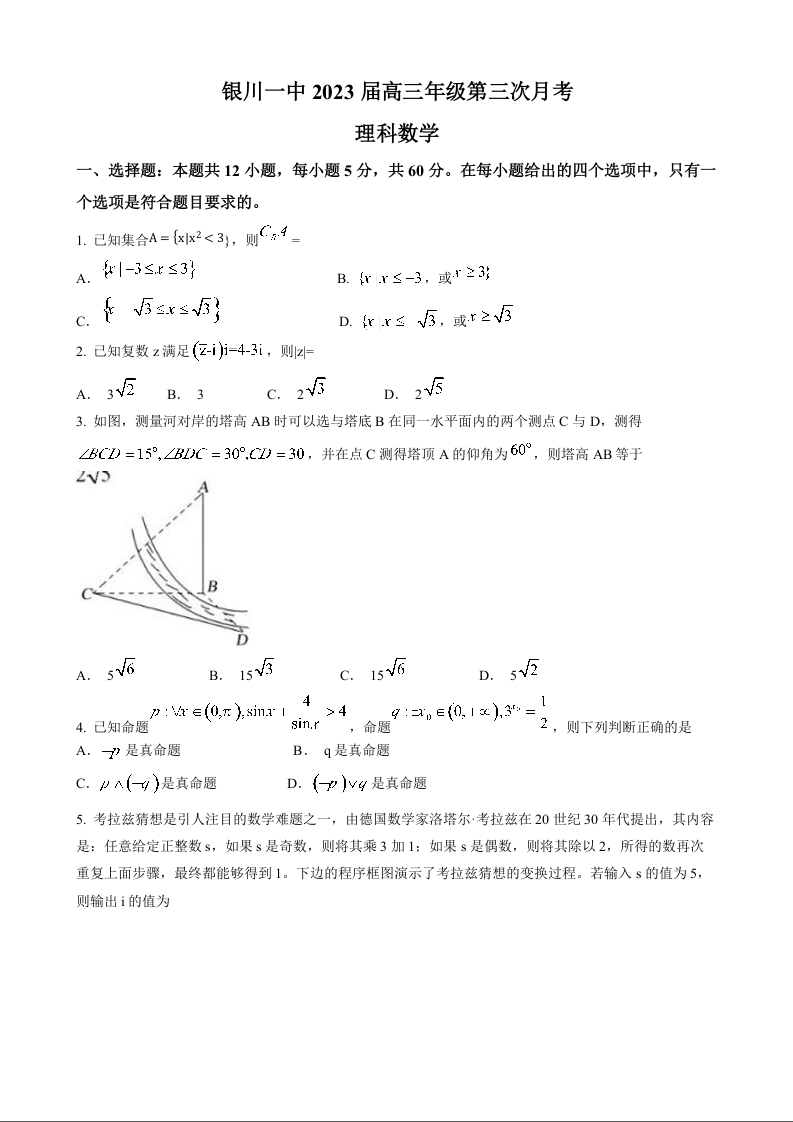 高三理数+答案--宁夏银川一中高三上学期第三次月考