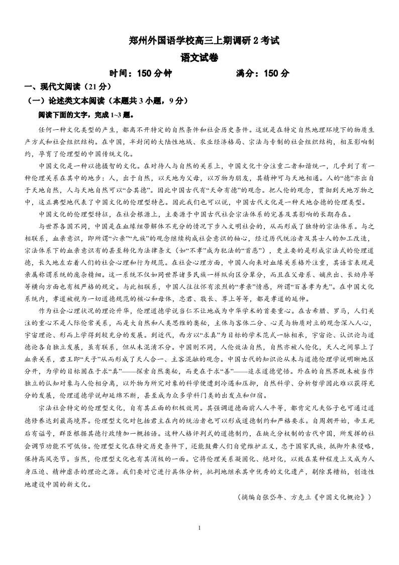 高三语文--河南省郑州市外国语学校2022-2023学年高三上学期12月月考