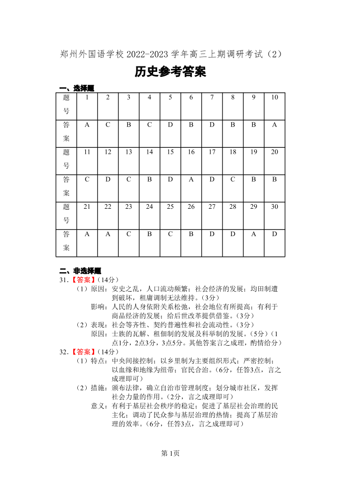 高三历史答案--河南省郑州市外国语学校2022-2023学年高三上学期12月月考