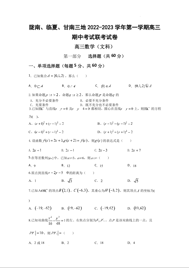 高三数学文--甘肃省陇南、临夏、甘南三地2023高三上学期期中联考