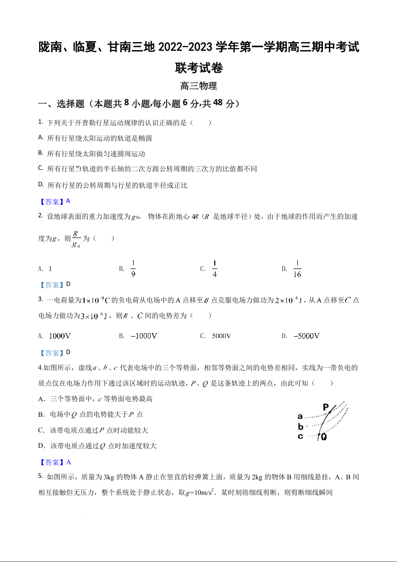 高三物理答案--甘肃省陇南、临夏、甘南三地2023高三上学期期中联考