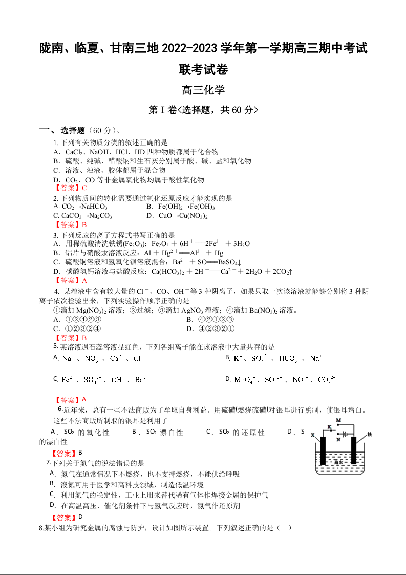 高三化学答案--甘肃省陇南、临夏、甘南三地2023高三上学期期中联考