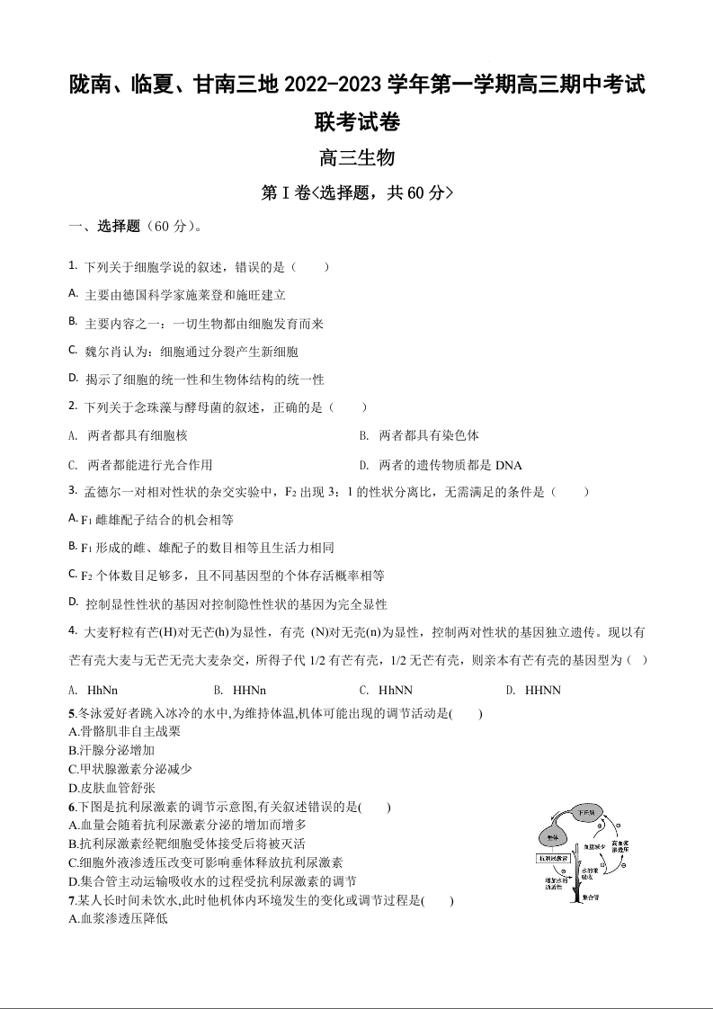 高三生物--甘肃省陇南、临夏、甘南三地2023高三上学期期中联考