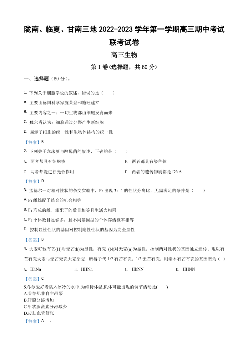 高三生物答案--甘肃省陇南、临夏、甘南三地2023高三上学期期中联考