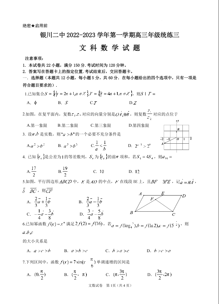 高三文数--宁夏银川市第二中学高三上学期统练三