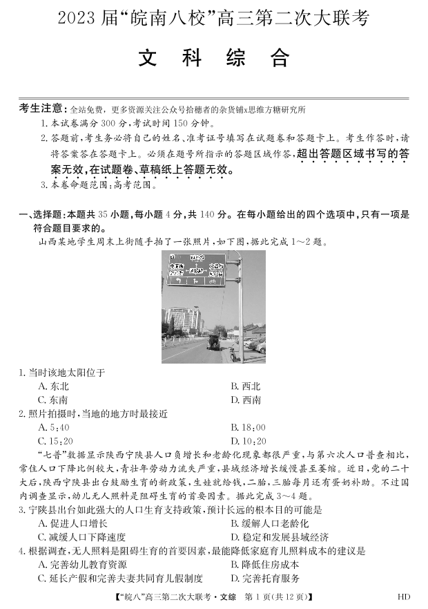 高三文综--安徽省皖南八校2023届高三第二次联考(全科)二模
