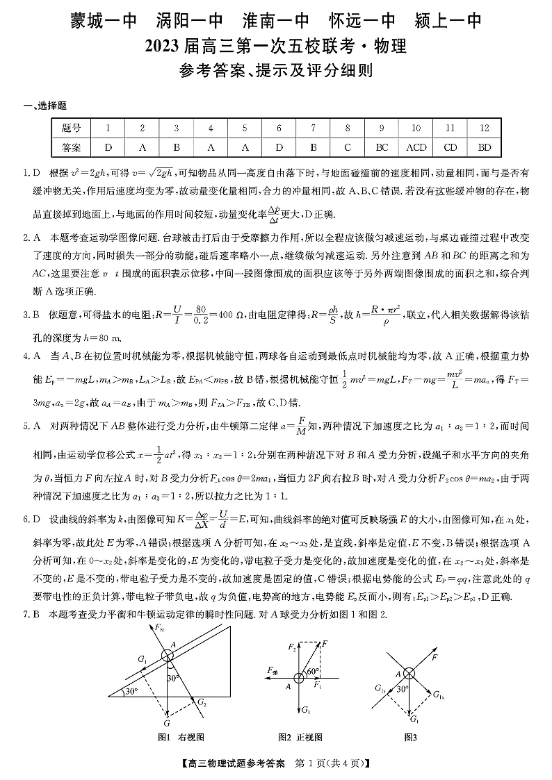 高三物理答案--安徽省皖北五校2023高三上学期第一次联考