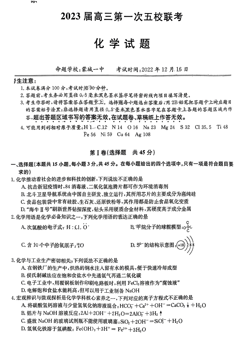 高三化学+答案--安徽省皖北五校2023高三上学期第一次联考