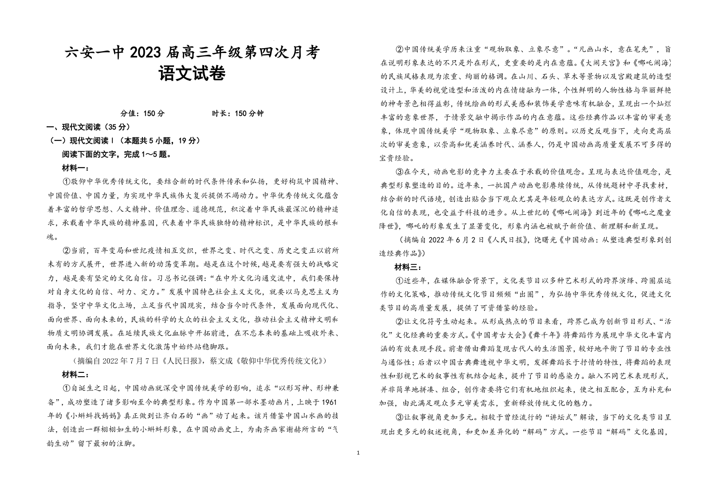 高三语文+答案--安徽省六安第一中学2023高三上学期第四次月考