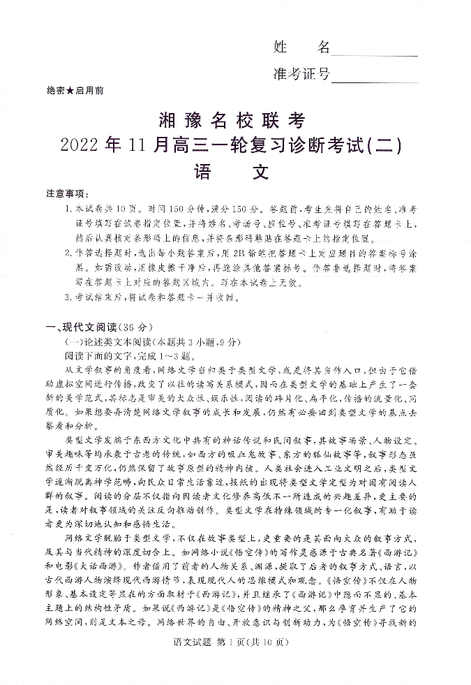 高三语文--湘豫名校联考高三上学期11月一轮复习诊断考试(二)