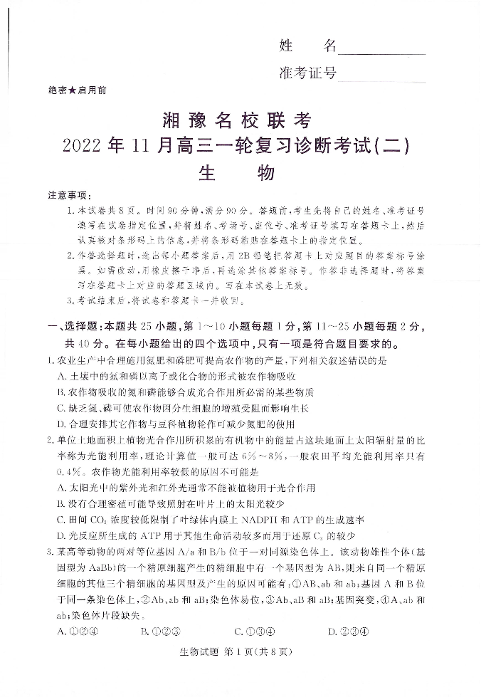 高三生物--湘豫名校联考高三上学期11月一轮复习诊断考试(二)
