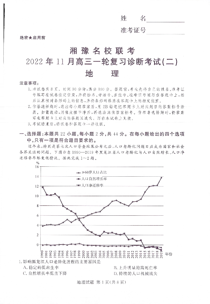 高三地理--湘豫名校联考高三上学期11月一轮复习诊断考试(二)