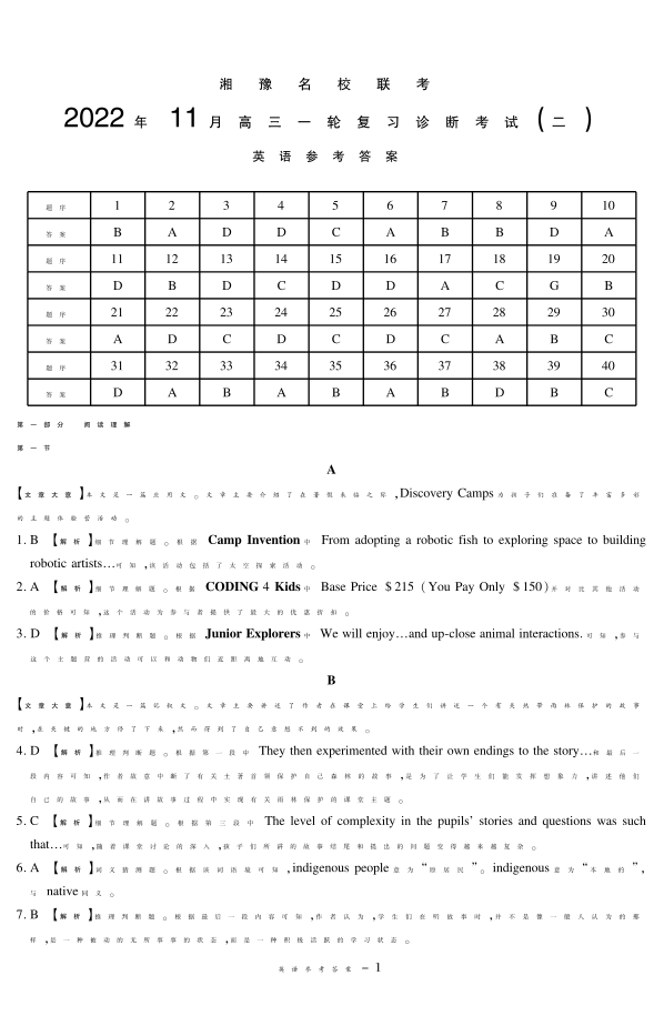 高三英语答案--湘豫名校联考高三上学期11月一轮复习诊断考试(二)