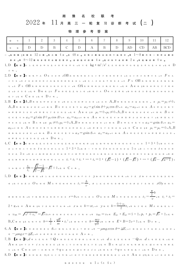 高三物理答案--湘豫名校联考高三上学期11月一轮复习诊断考试(二)
