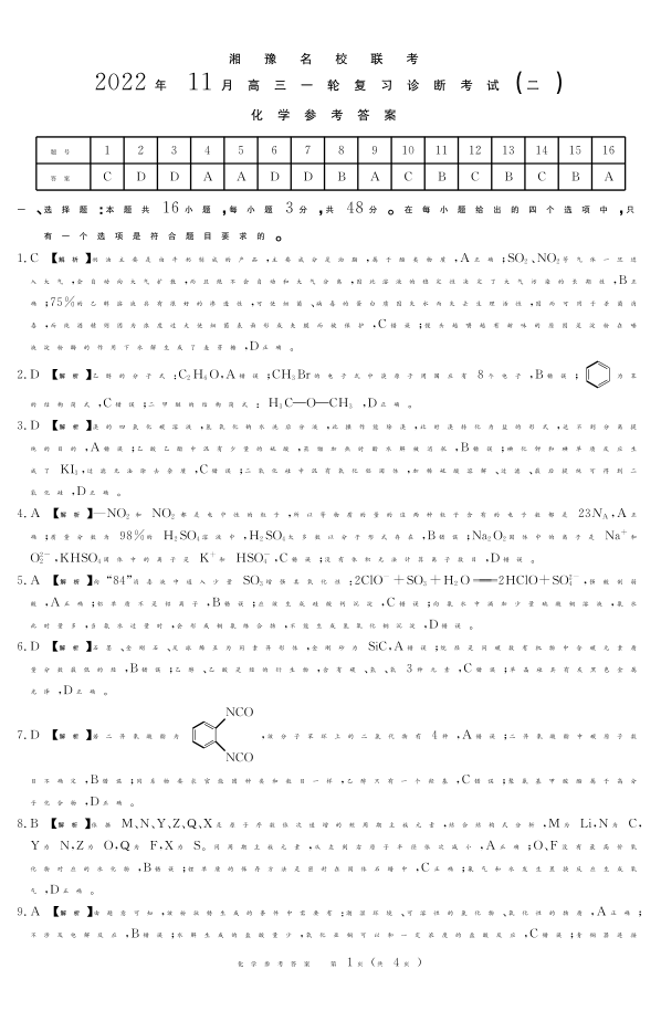 高三化学答案--湘豫名校联考高三上学期11月一轮复习诊断考试(二)