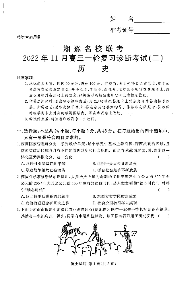 高三历史--湘豫名校联考高三上学期11月一轮复习诊断考试(二)